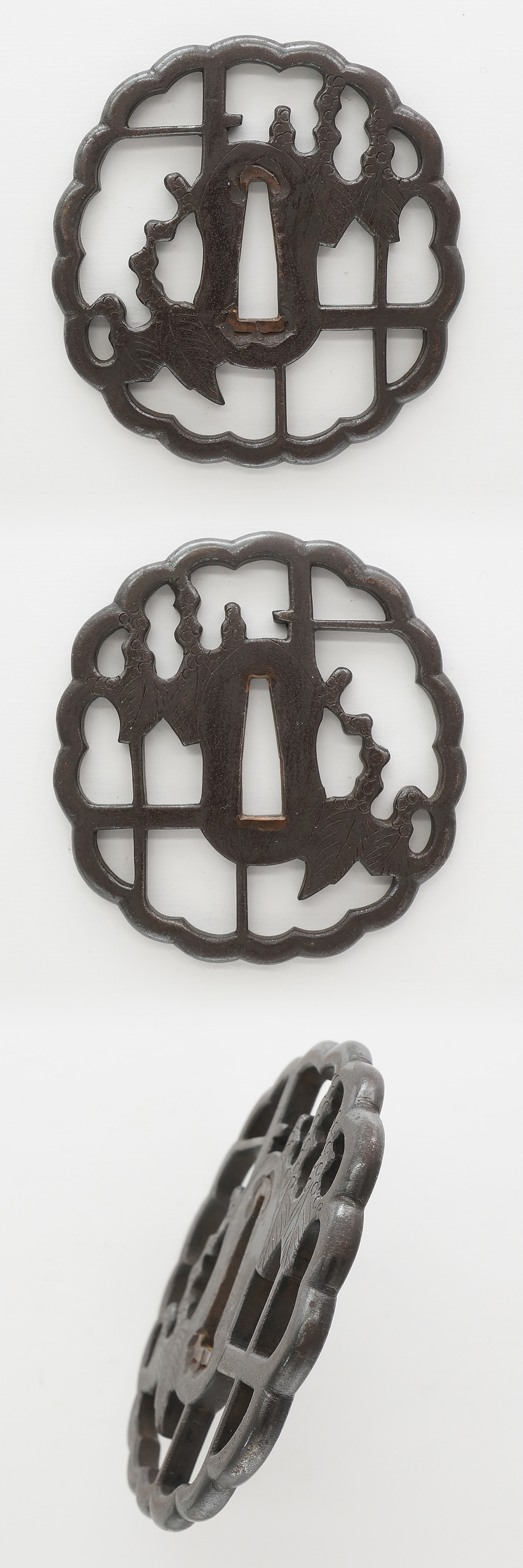 Special feature: Chrysanthemum shape iron tsuba with window, paulownia engraved.