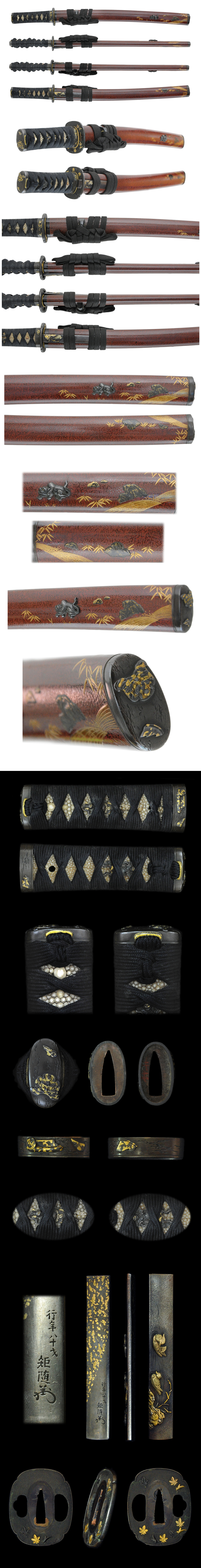 Saya : On the brown red color, black design are painted and engraved a tiger by syakudo plate.