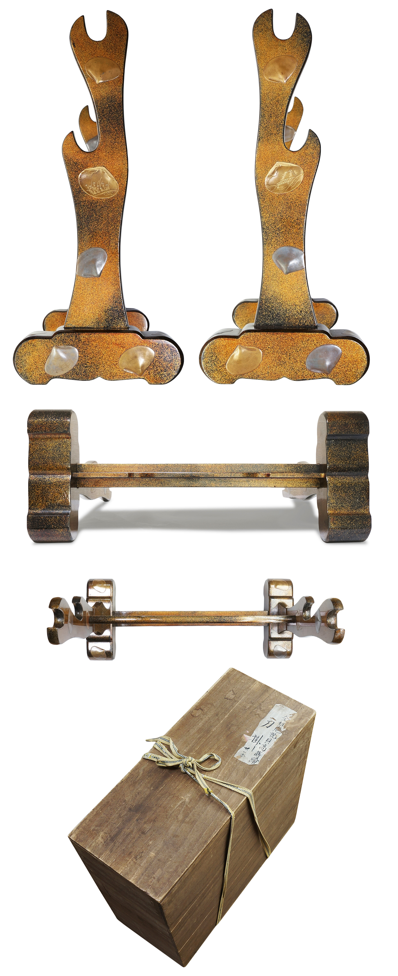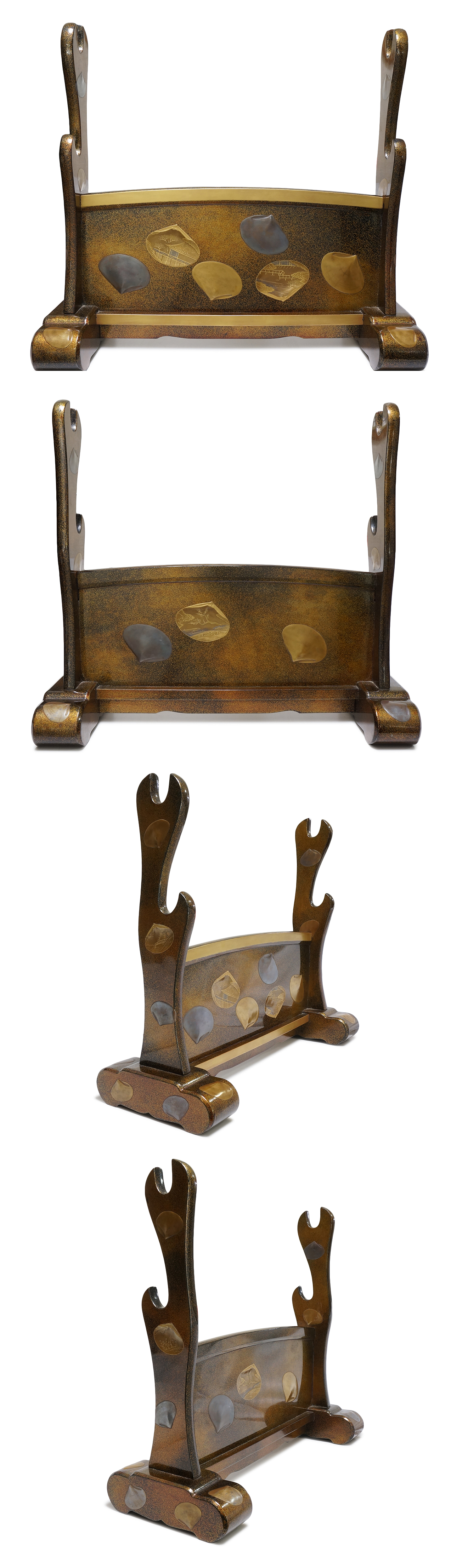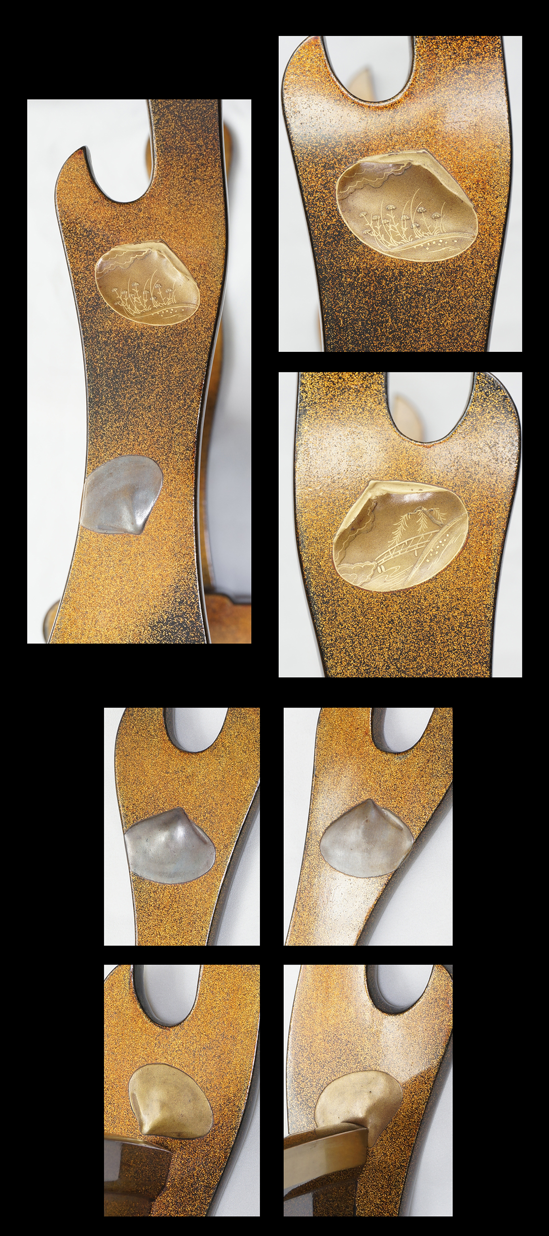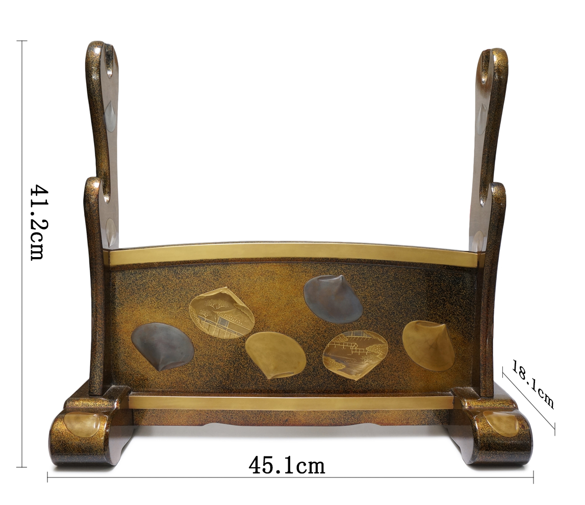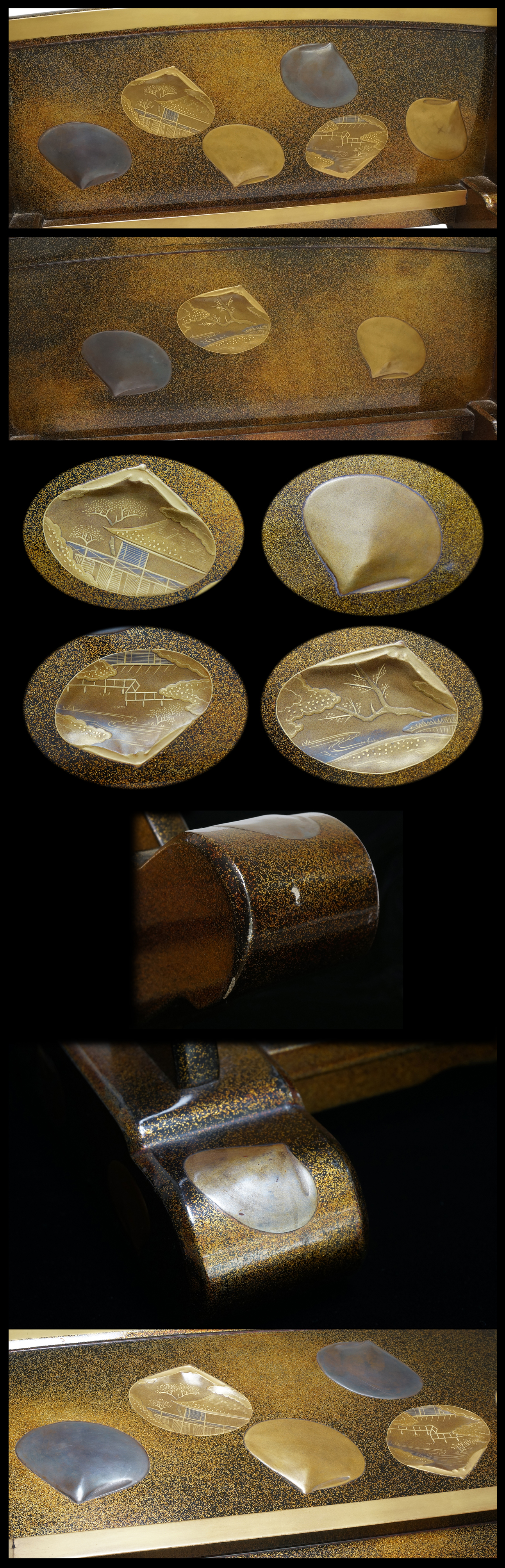 Special feature: This sword stand is decorated with excellent gold Nashiji. Shell design is engraved with some shell pattern engraved. Scenery design is reflected on the shell. There are some small Kizu on the ashi but it is not serious.