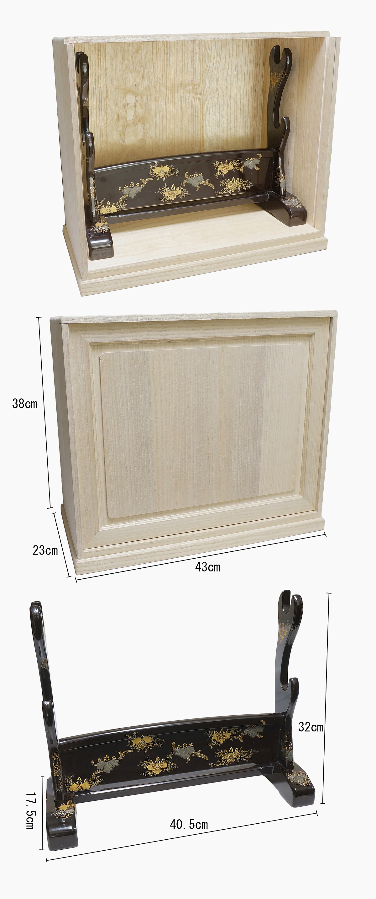 Sword stand : Mei (signature) : Mumei (unsigned) Sword stand: Length : Width 49 cm x Depth 18 cm x Height 43 cm ( Width 19.29 inches x Depth 7.08 inches x Height 16.92 inches) Kiri Box: Length : Width 64 ...