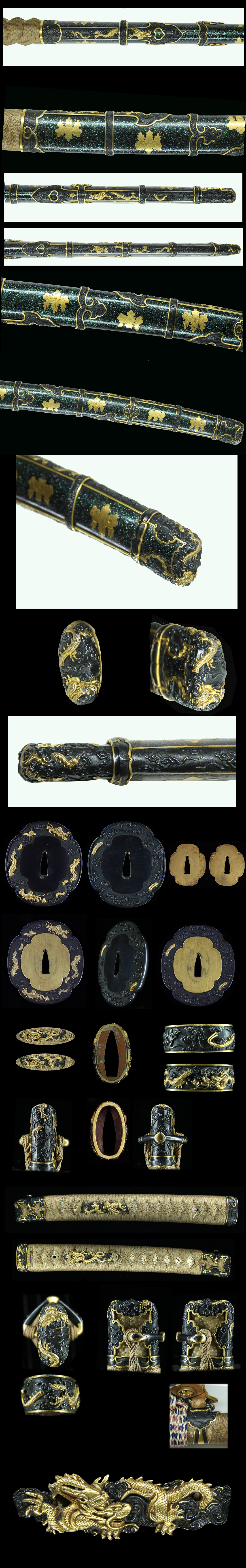 Tsuba : On the syakudo nanako plate, rise up mimi and engraved dragon and clouds.