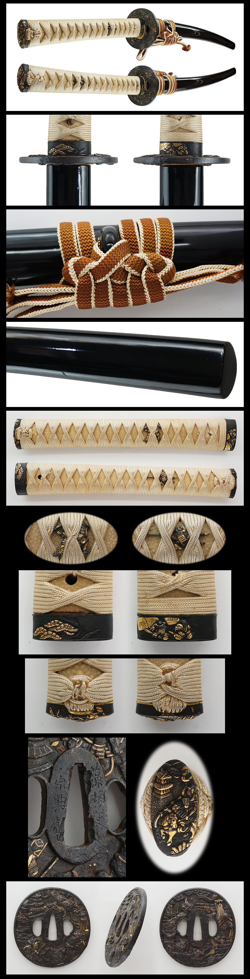 Menuki: Shakudo plate with warrior design engraved and inlaid with gold.