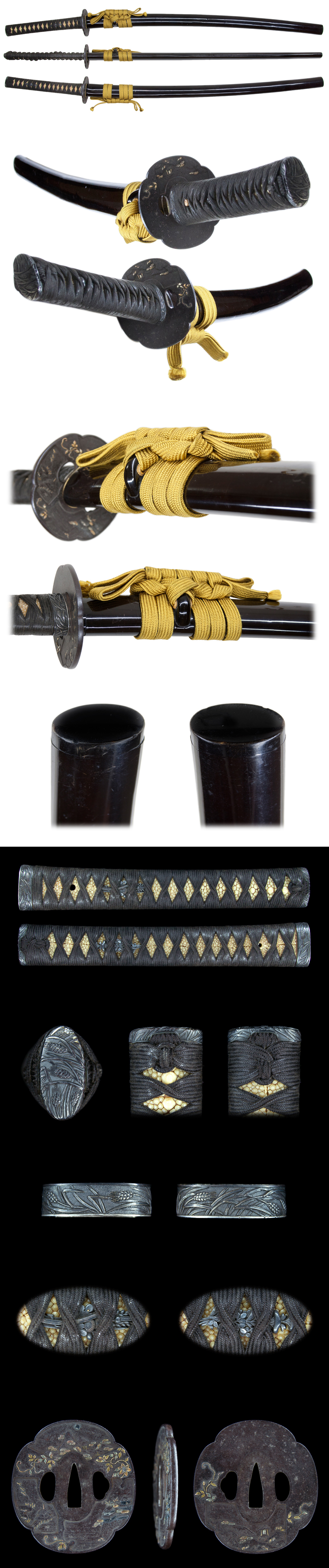 Tsuba : on the iron Tsuba, many flowers are engraved with gold color.