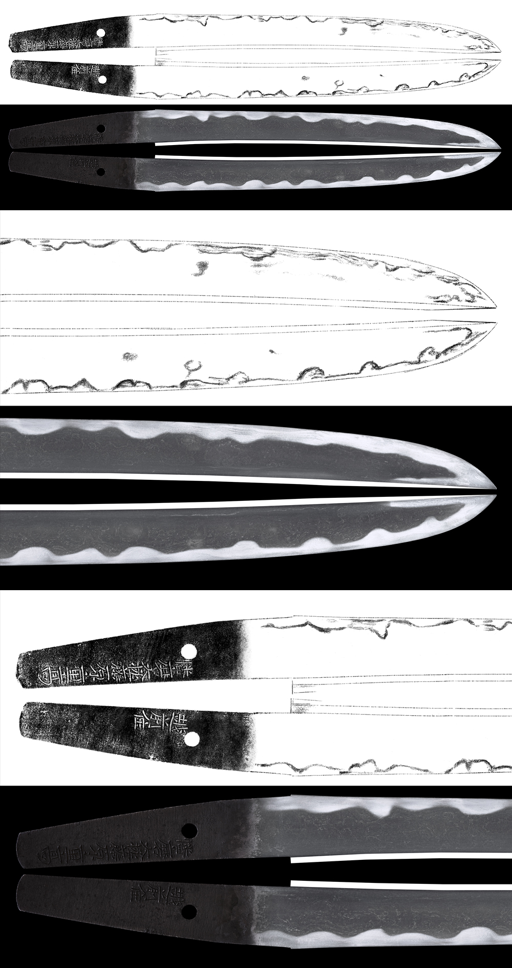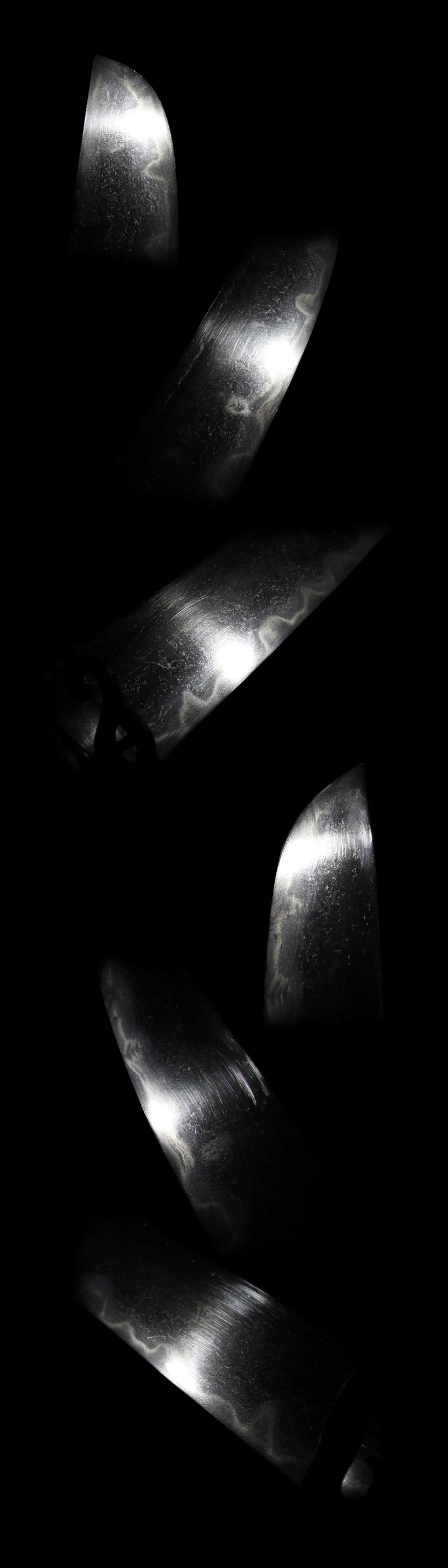 Hamon: Nie deki sharp gunome midare hamon. Tobiyaki (spots of temperline) with rustic hamon.