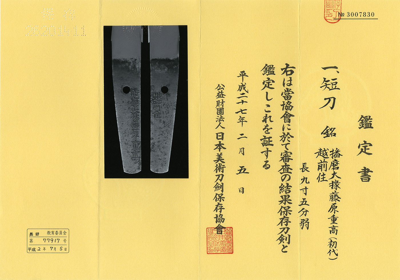 Special feature :Harima Daijyo Fujiwara Shigetaka is a sword smith of Echizen school who was active during Kanei period. The family continued until 11th generation around Kaei period(late Edo Period).