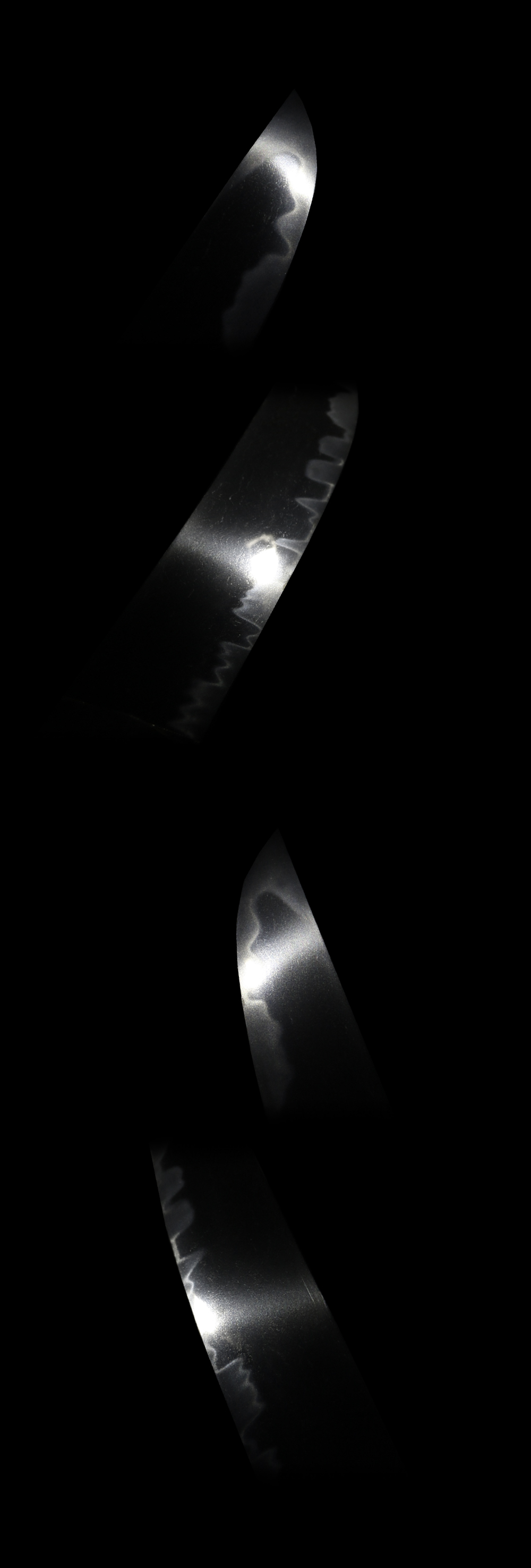 The Hamon is square shape gunome midair and same hamon on bit sides of the blade.