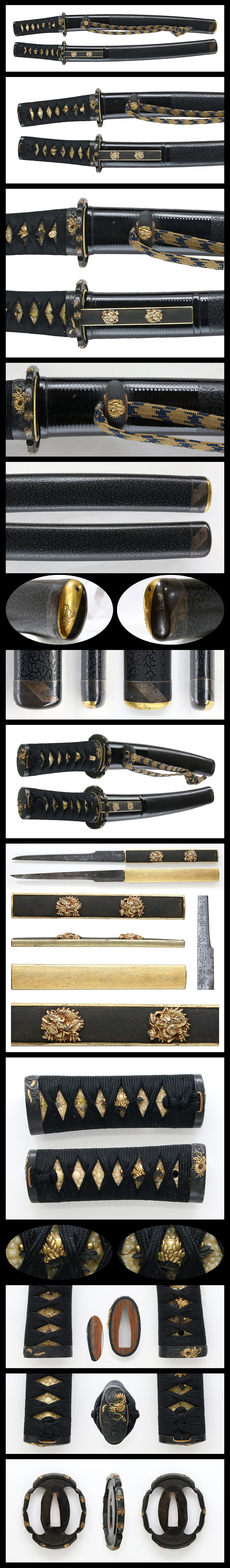 Kozuka and Kogatana: Shakudo, two dragons are engraved with gold color.