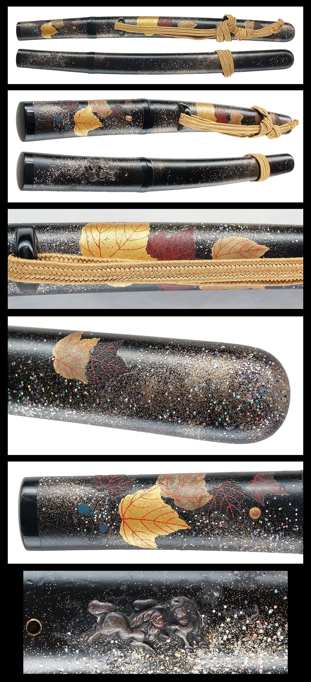 Saya : Black plate with leaf design engraved. It is yellow and red with much abalone sparkle.