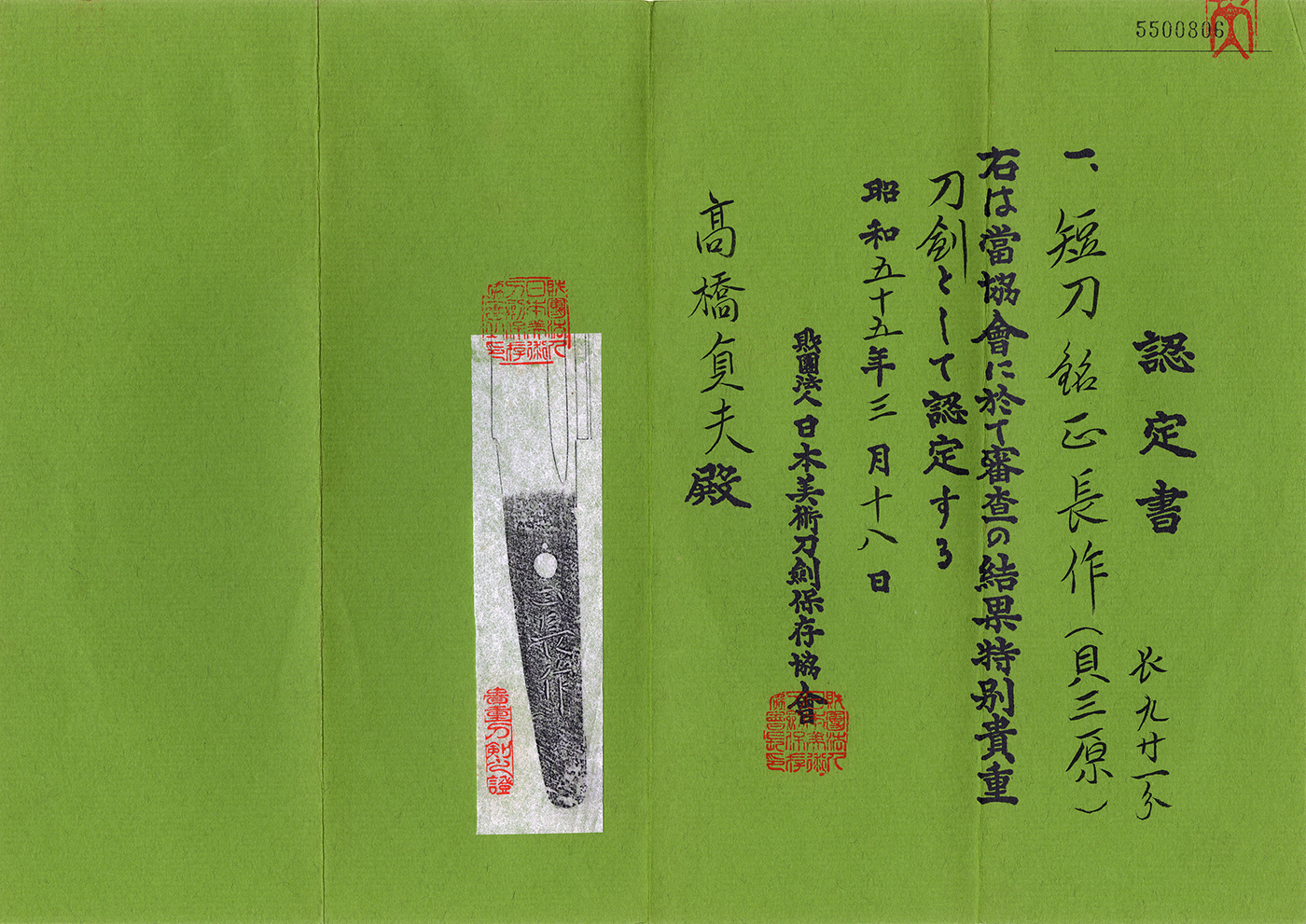 Special feature : Masanaga(Kai-Mihara) is sword smith of Kai-Mihara school, which is related to Bingo Mihara school. Some sword smiths in Kai-Mihara school put the word 'Kai' (shellfish) in thier signature.