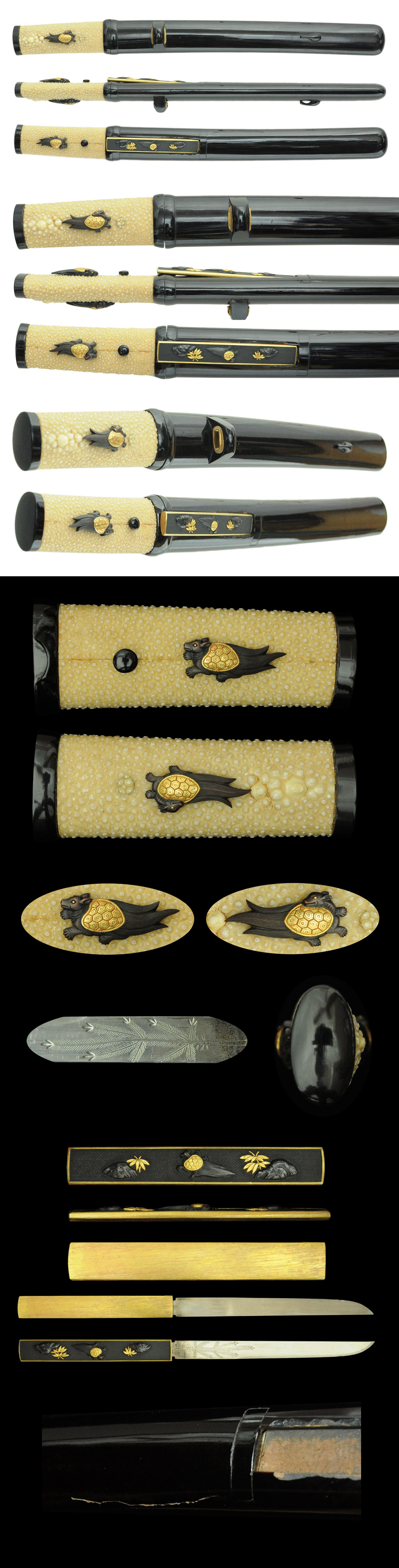 Menuki : On the shakudo nanako plate, a turtle is engraved with gold color.