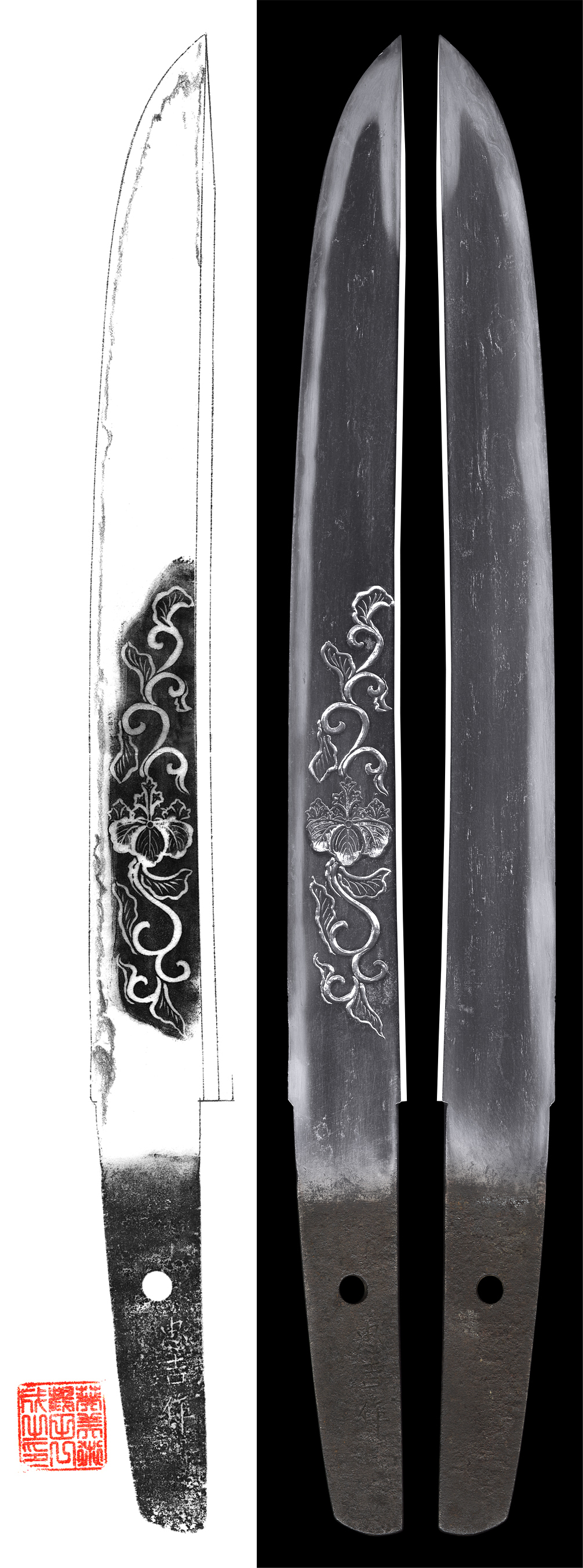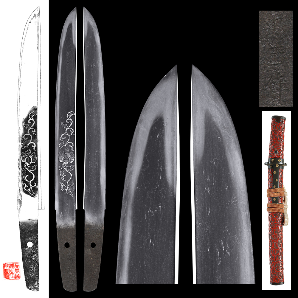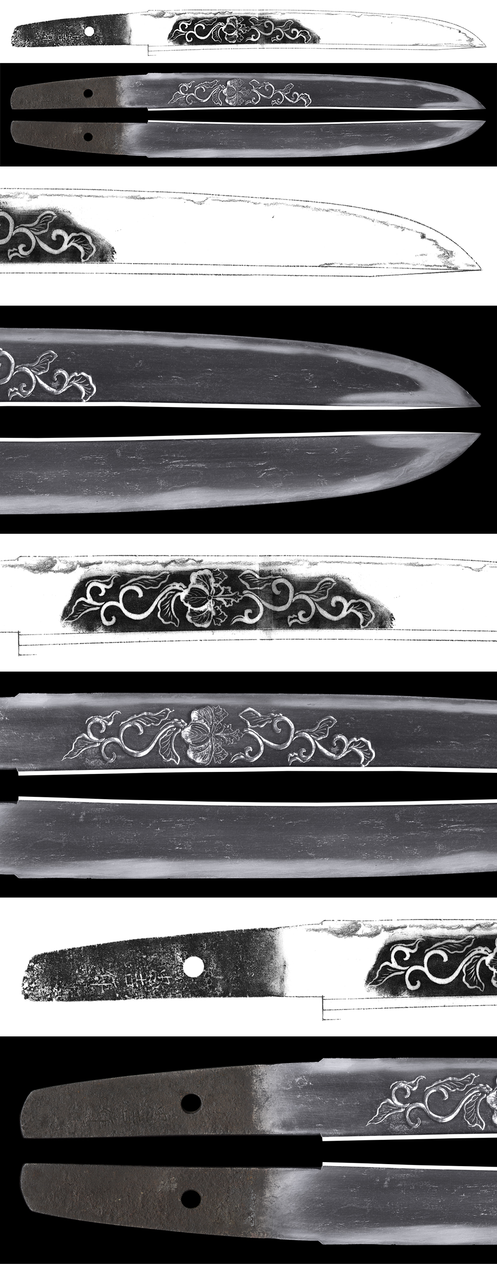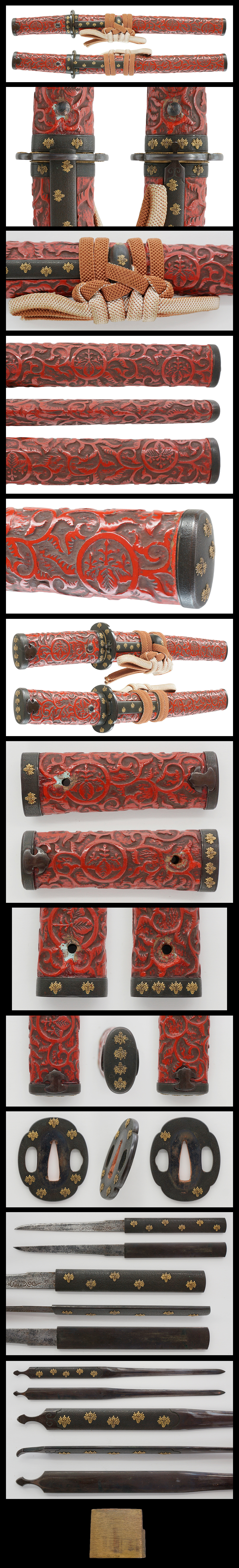 Tsuba, Fuchikashira, Kojiri, Kurikata, Kozuka, Kogai : On the syakudo ishimeji, Kiri mon are negraved with gold color.