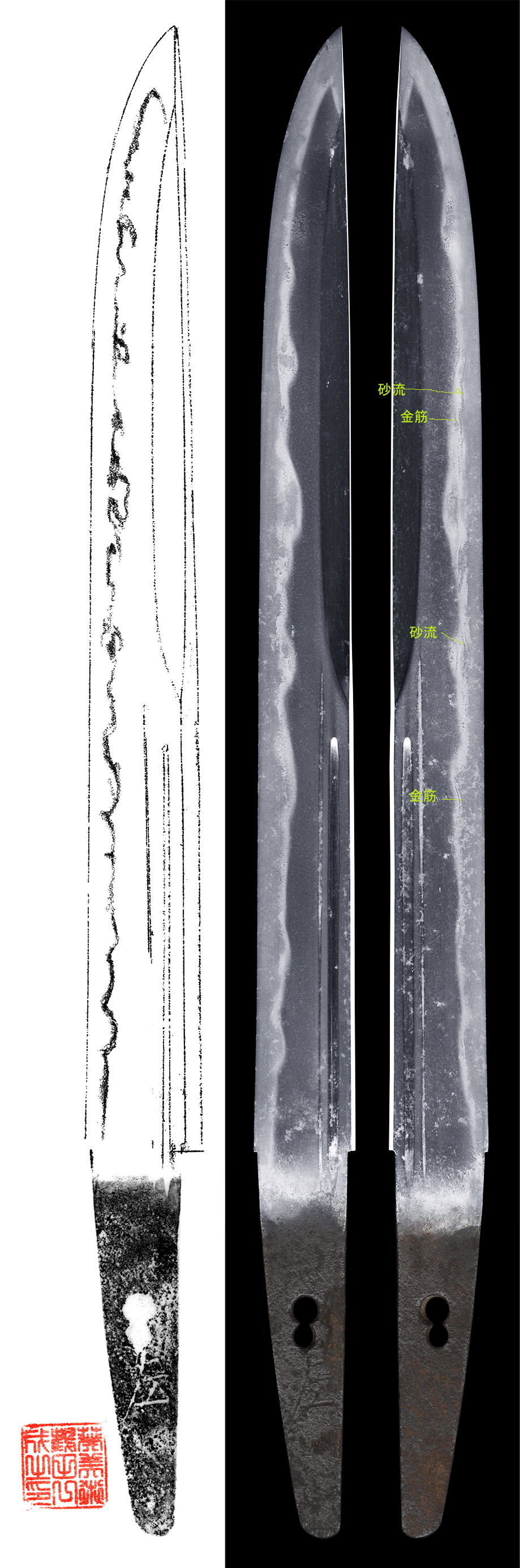 Shape : It is Kanmuri Otoshi piece and there is Hi and Soe-Hi engraved at both side of the blade.