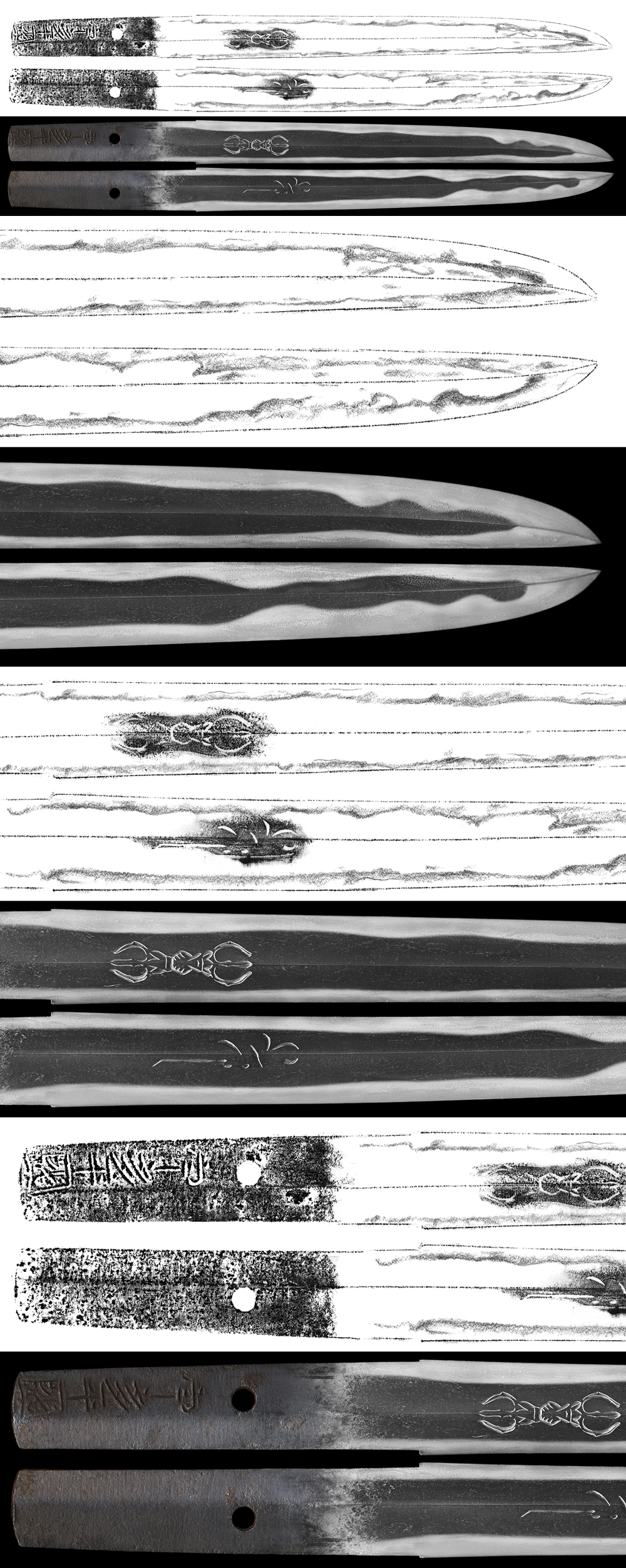 Hamon : Niedeki Suguha with Notare and Gunome midare, with thick nioikuchi and a lot of soft ashi, sunagashi, Yo and Kinsuji