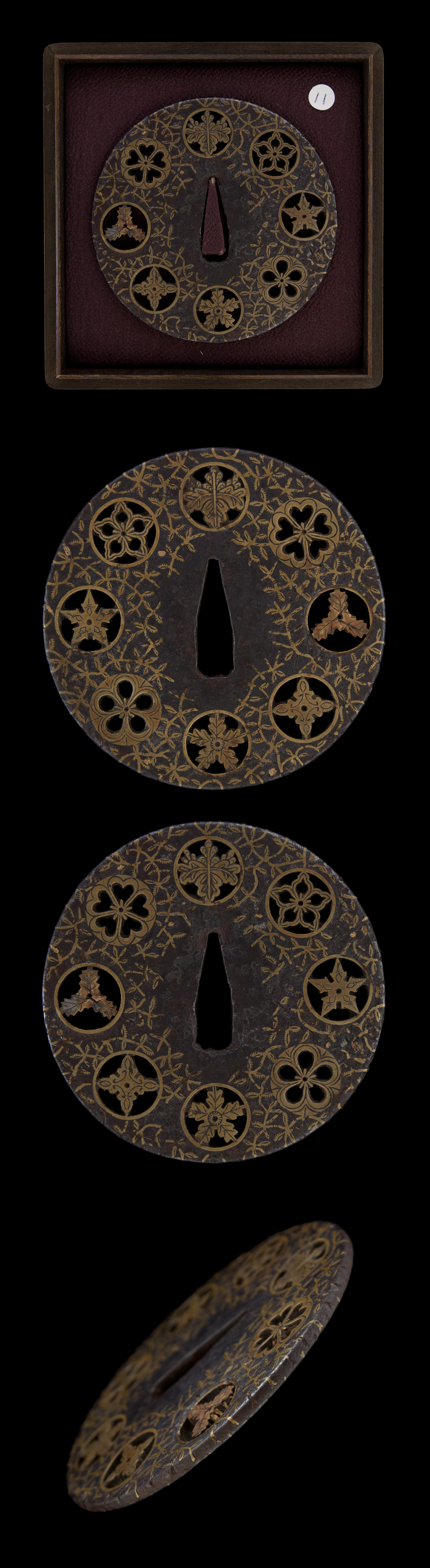 Special feature: Round shape Iron tsuba with Shinchuu inlay. There is