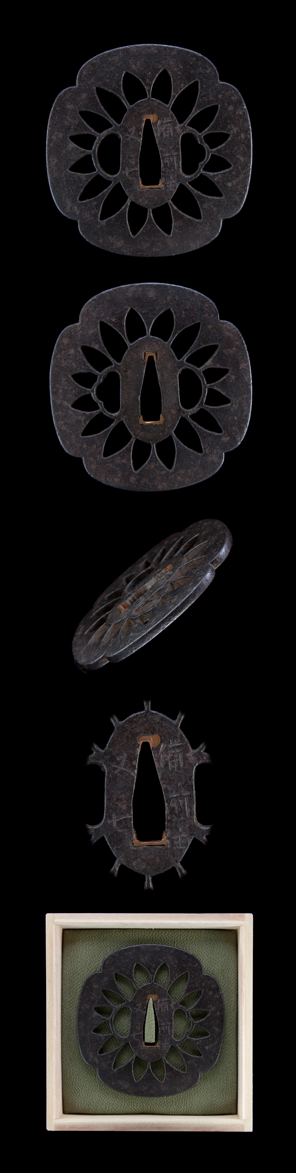 Tsuba:(NBTHK Hozon Paper) Mei (signature) : mumei(Bushu) Length : 7.9cm x 7.6cm ( 3.11inches x 2.99 inches) Thickness of rim: 0.4cm ( 0.16inches) Jidai(era) :Edo Period Weight:96g Special feature: Tatemarugata iron tsuba with Shippo pattern engraved in openwork. It is ...