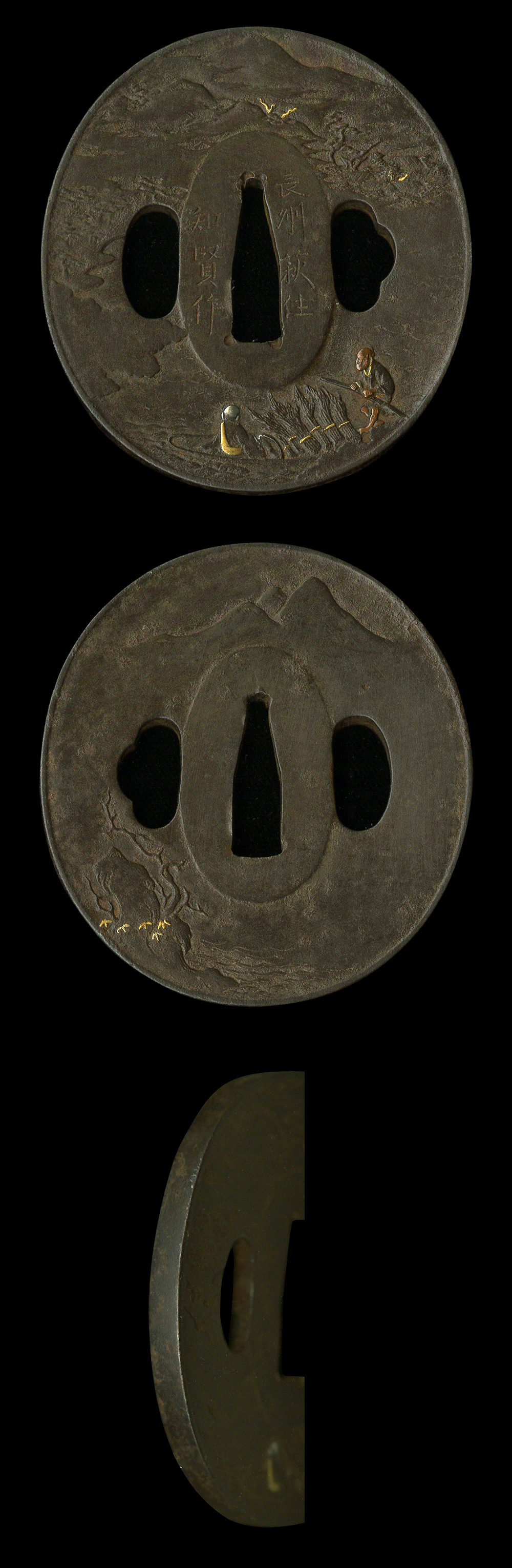 Special feature: Round shape iron tsuba with landscape scenery and men on raft is engraved and inlaid with gold and copper.