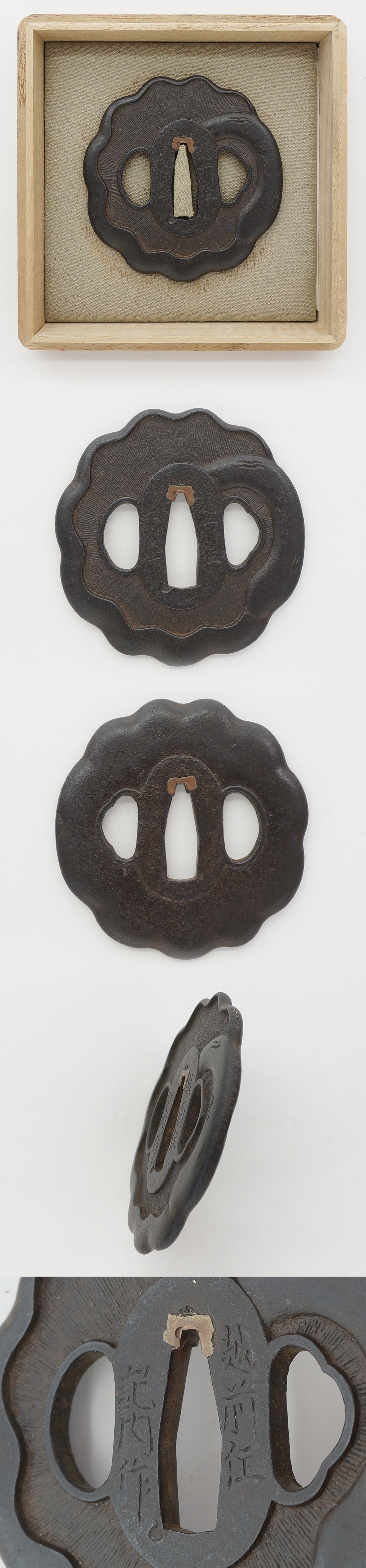Ordering number : F12264 Tsuba: Mei (signature) : Mogarashi Nyu-do Souten sei Length : 7.98 cm x 7.45 cm (3.14 inches x 2.93 inches) Thickness of rim : 0.34 cm (0.13 inches) Jidai(era) : Edo period. Special feature:On the Iron ...