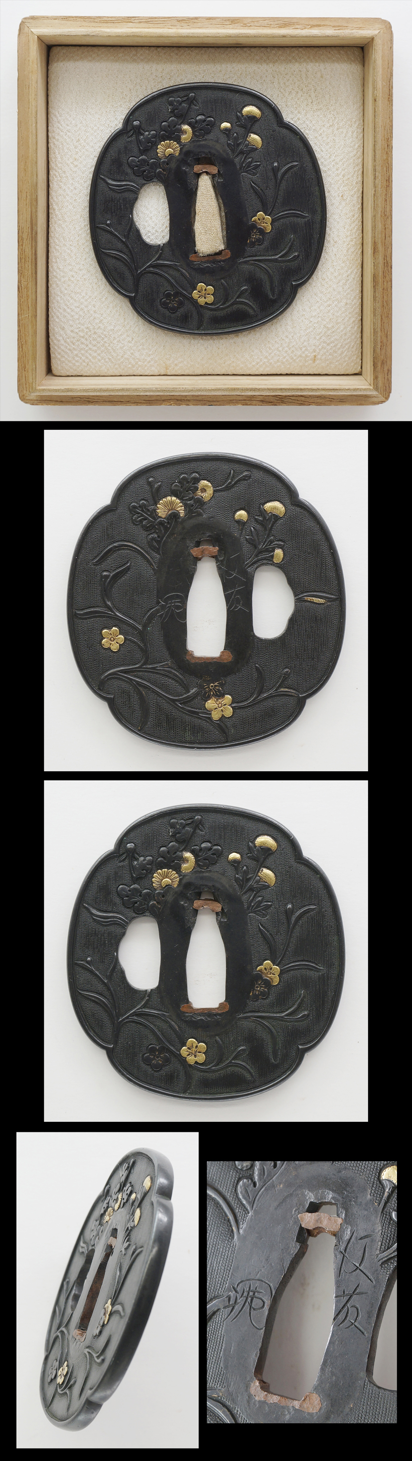 Special feature : On mokko shape Shakudo Nanakoji tsuba, Kiku(Chrysanthemum) and Sakura flowers are engraved with gold and silver color iroe.