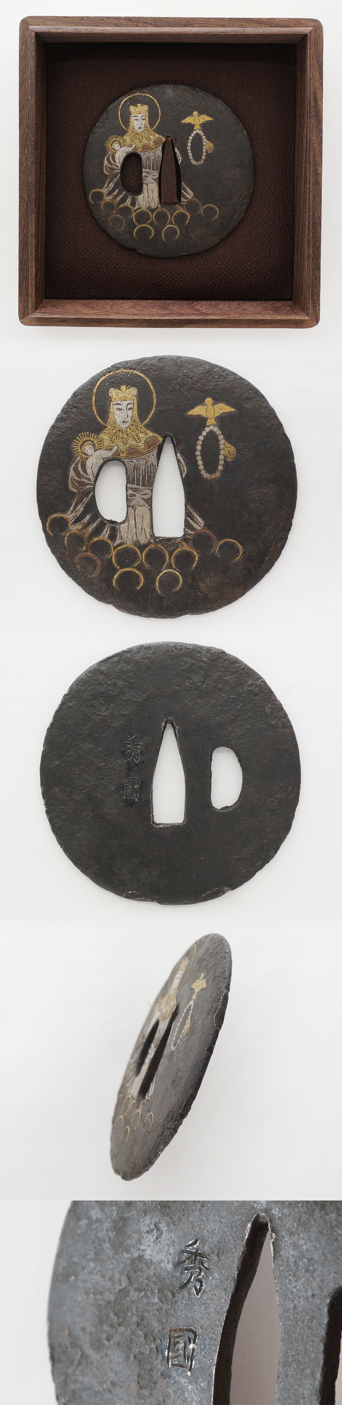 Special feature: Round shape iron Tsuba, the Christ, virgin Mary and spirit are paited with gold and silver color.