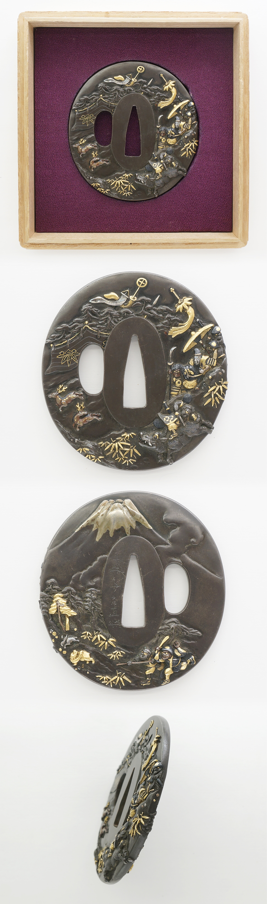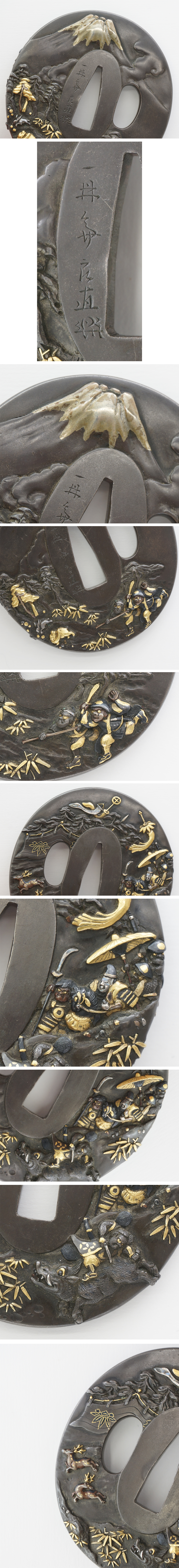 Special feature:Tatemaru shape shibuichi tsuba with warrior design engraved and inlaid with gold, silver and brass. The engraving is fine and nice. The first generation Yoshinao is the student of Hamano Chokuzui and has produced many works with warrior.