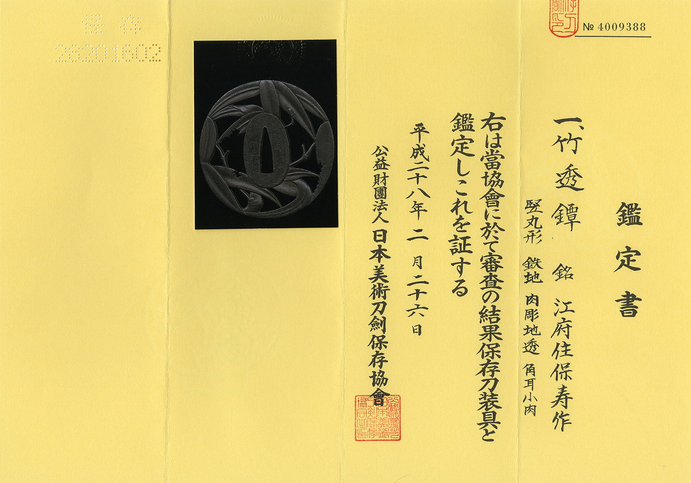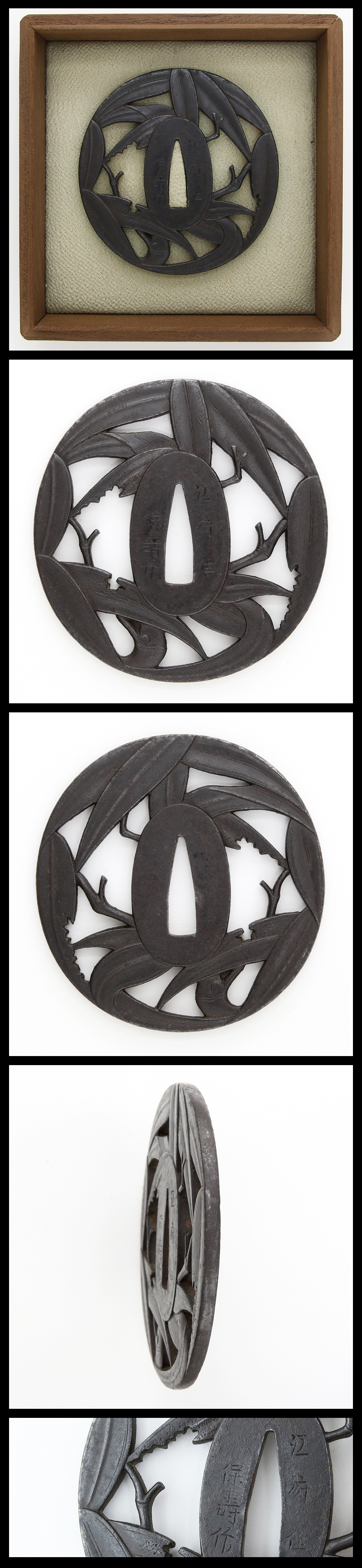 Special feature : Round shaped iron Tsuba. Openwork bamboo leaves are engraved in detail, even some leaves are eaten by bugs. The design is so realistic but useful at the same time, there's Koduka Kogai hitsu.