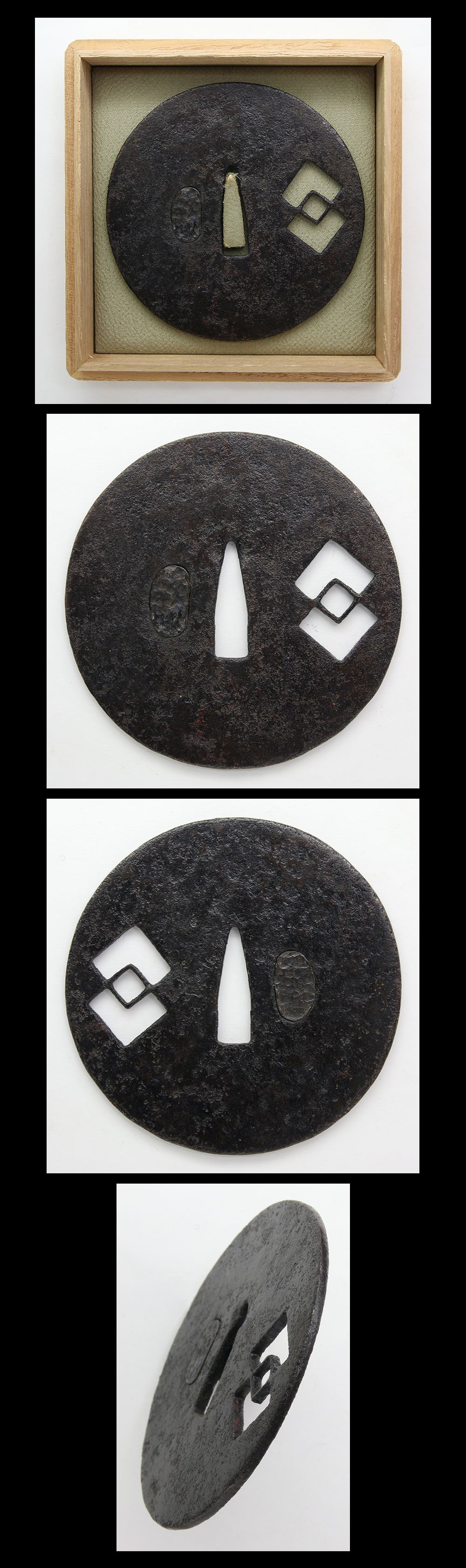 Special feature : On the large sized round shaped iron Tsuba, two square is engraved in openwork
