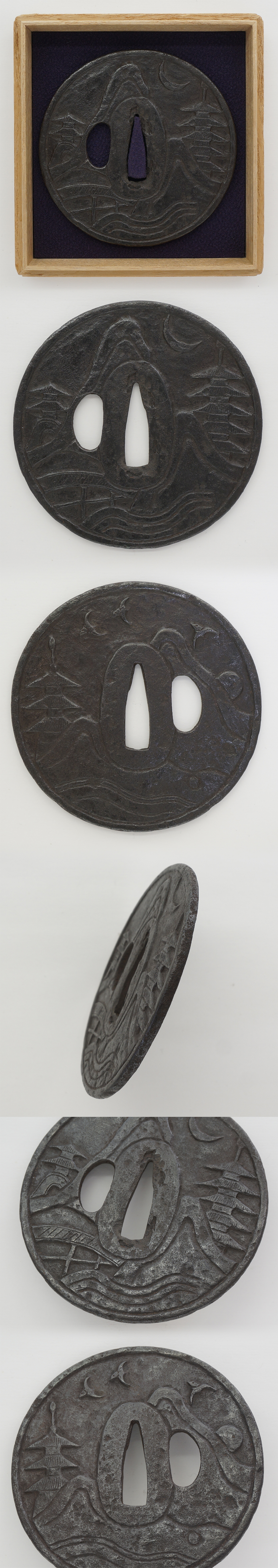 Special feature: Round shape iron Tsuba, The pagota and landscape are engraved.