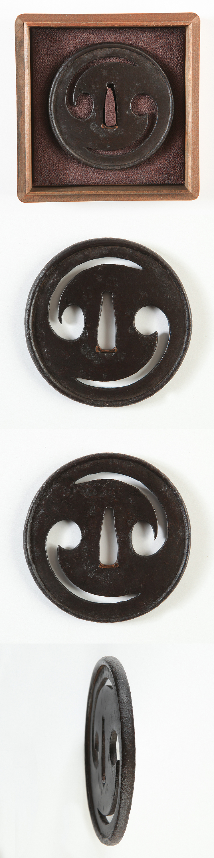 Special feature: Round shape iron tsuba with Futadomome(double comma shape heraldic design) engraved.