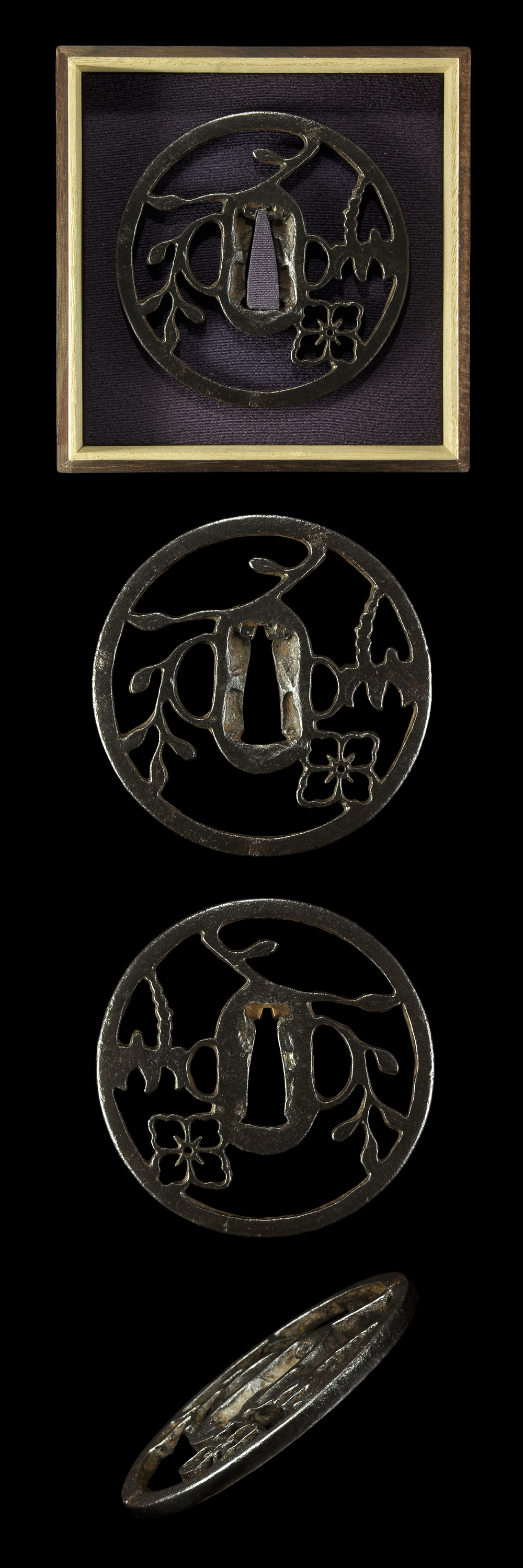 Special feature: Round shape iron tsuba with the family crest of paulownia flower and seaweed engraved in openwork. The iron texture is smooth and nice. Elegant tsuba.