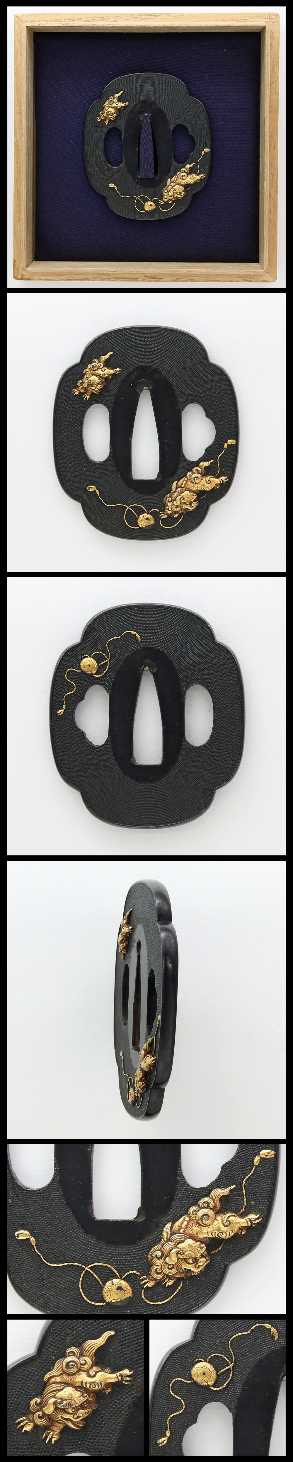 Special feature: Mokko shape shakudo nanakoji tsuba with watch ShiShi dog engraved and inlaid with gold.