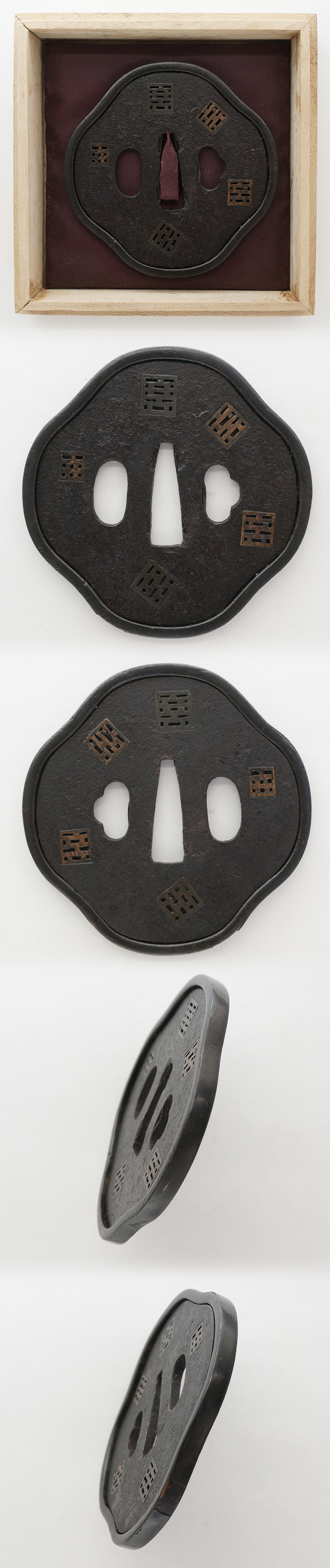 Ordering number : F12466 Tsuba : Shingen Tsuba. Mei (signature) : Mumei(Unsigned) Length : 8.15 cm x 7.83 cm ( 3.20 inches x 3.08 inches) Thickness of rim : 0.36 cm ( 0.14 inches) Jidai(era) : On the square Tsuba, ...