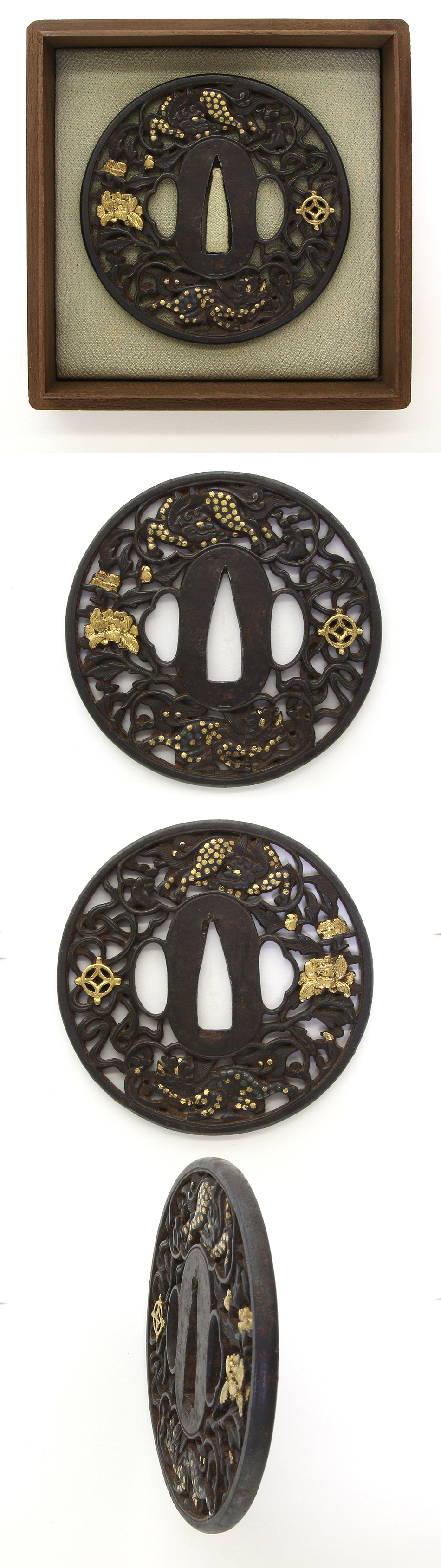 Special feature: On the round shape iron Tsuba, the Shishi-dogs and peony, crest of seven treasures in buddhism are engraved as openwork with gold inlay and color.