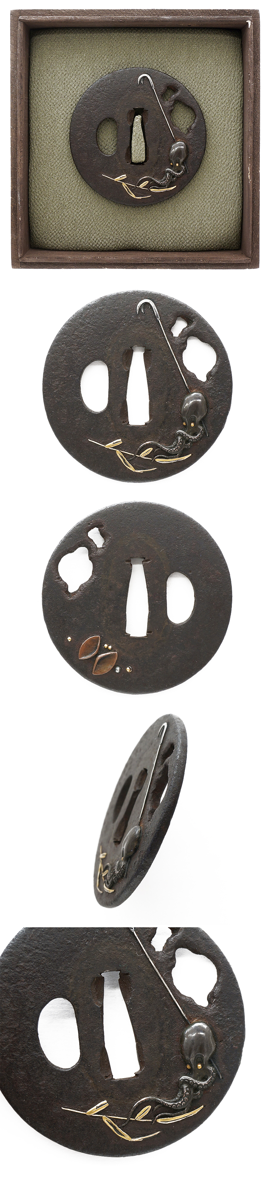 Special feature: Round shape iron Tsuba, octopus, fishing tackle and shell are engraved with gold, silver and copper color.