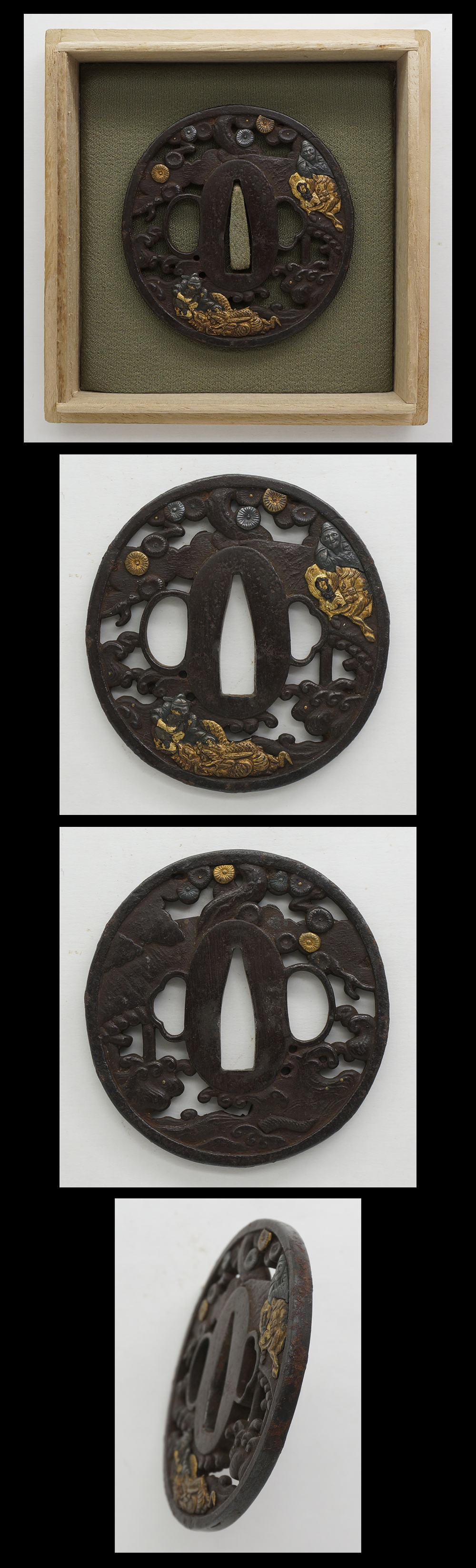 Special feature : On oval shape iron tsuba, Kosekiko(Chinese hermit) riding on a horse and Choryo( military strategist in ancient China) riding on a dragon is engraved and inlayed with gold.