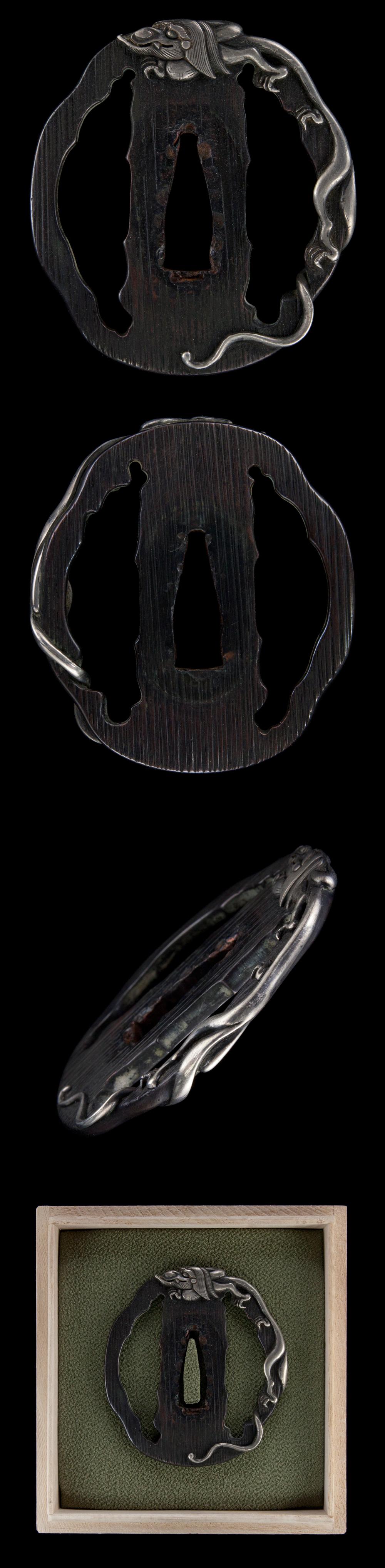 Ordering number : F10041 Tsuba: Mei (signature) : Mogarashi Nyudo Soten sei Length : 8.19 cm x 7.81 cm ( 32.2 inches x 3.07 inches) Thickness of rim: 0.47 cm ( 0.18 inches) Jidai(era) : Edo period. Special feature: On ...