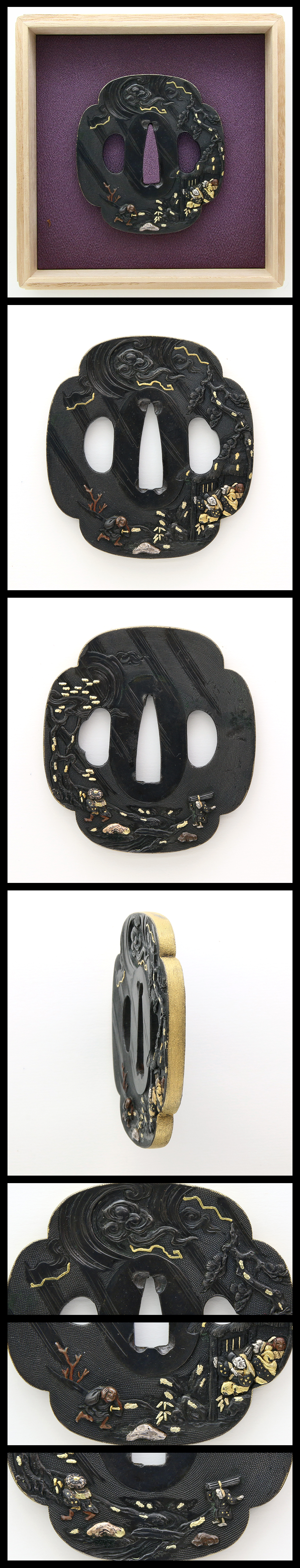 Special feature:Mokko shape iron tsuba with shakudo nanakoji plate engraved. A summer afternoon shower scene is engraved and inlaid with gold, silver and copper. The origin of Tetsugendo is Okamoto Shoraku who was one of the top three metal smith in Kyoto.