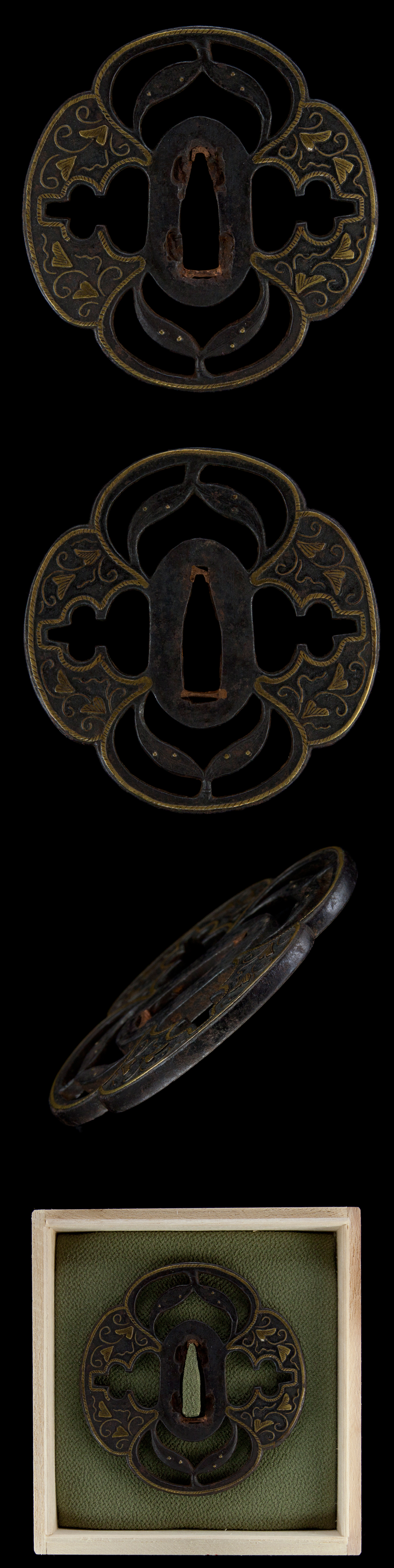 Tsuba : (NBTHK Hozon paper) Mei (signature) : Mumei (Akita Syoami) Length : 7.14 cm x 6.83 cm ( 2.81 inches x 2.68 inches) Thickness of rim : 0.44 cm ( 0.17 inches) Jidai(era) : Edo period Special feature : ...