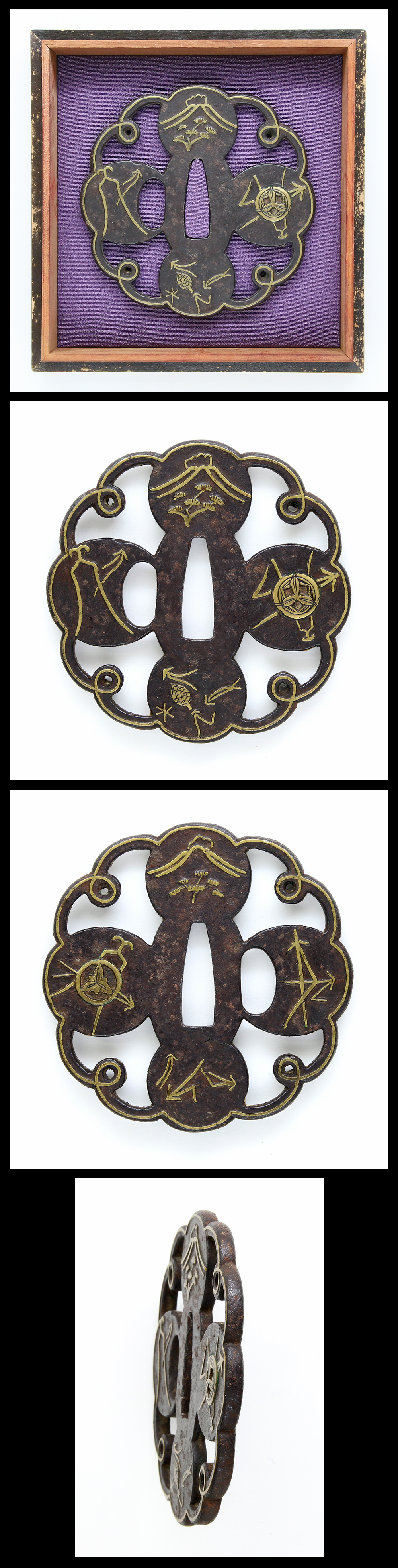 Special feature:On chrysanthemum shape iron tusba, Fuji mountain and family crest design is engraved in Chinchu Zogan style. It is a bringer of good luck. IT would be nice item to buy at new year.