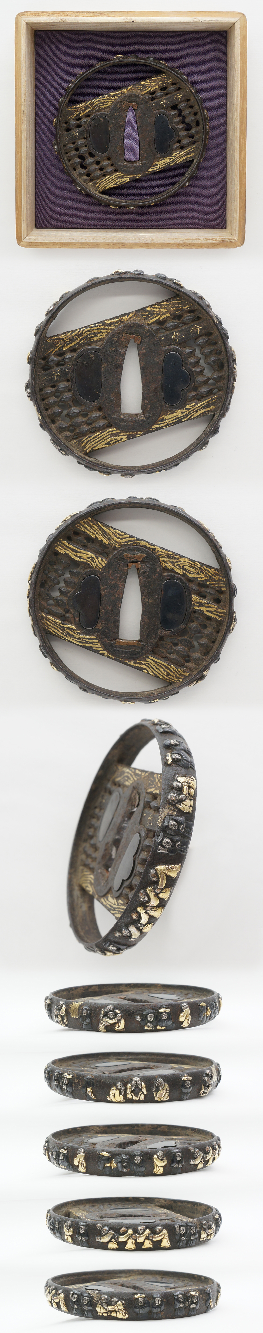 On the Okesoko-Mimi(rim shape of the bottom of wooden bucket)men is engraved and inlaid with Suemon zogan style. It is magnificent and rare design tsuba.