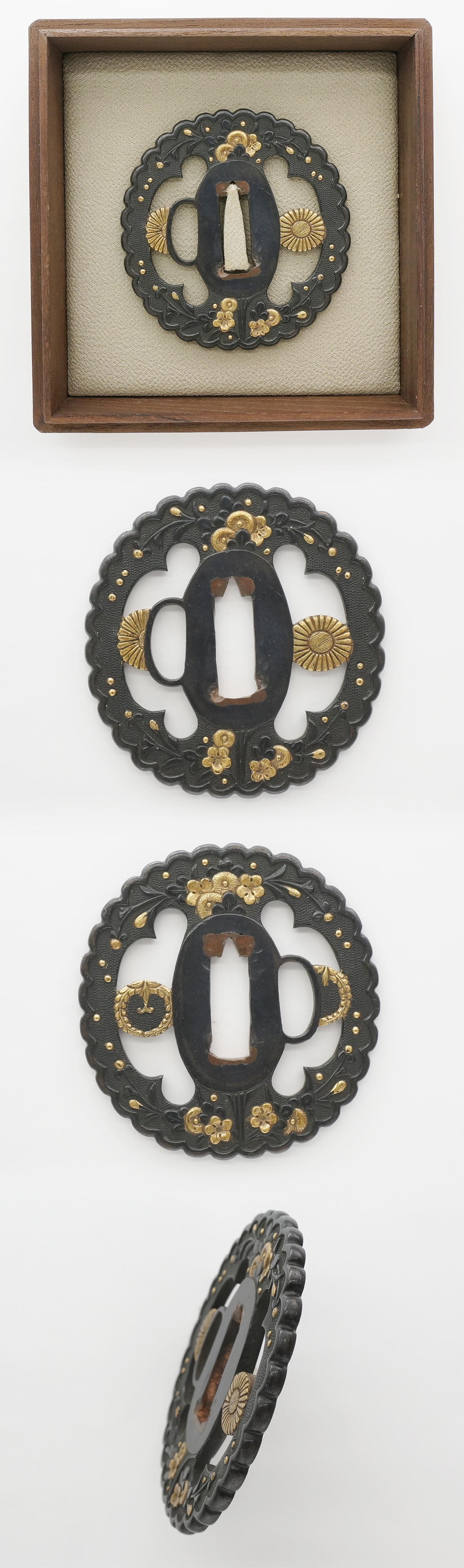 Special feature:Chrysanthemum design shakudo nanakoji tsuba with plant and flower design engraved and inlaid with gold.
