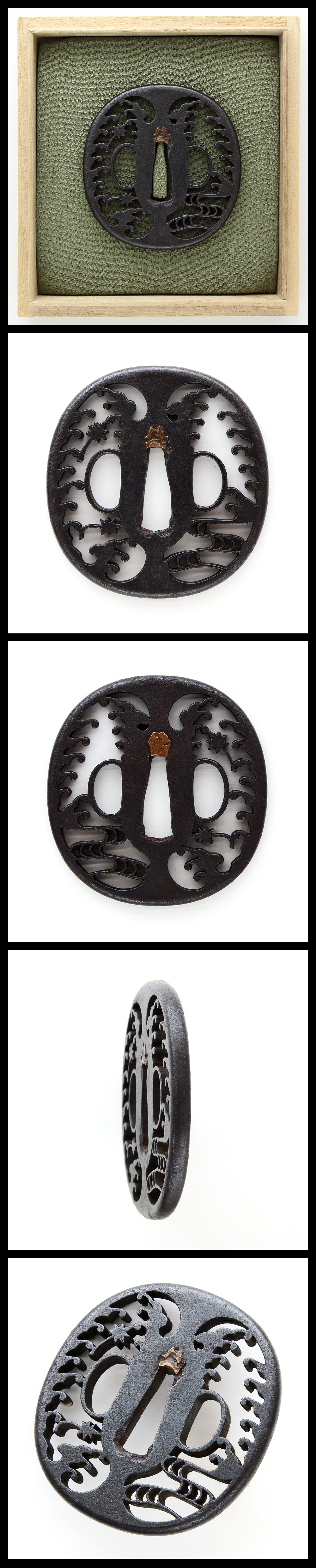 Special feature:Tatemaru shape iron tsuba with Tatsuta river and maple leaf design engraved in openwork. Tatsuta river where it is located in Ikoma domain, Nara prefecture is a famous spot for viewing the red Japanese maple. This elegant design express season very well.
