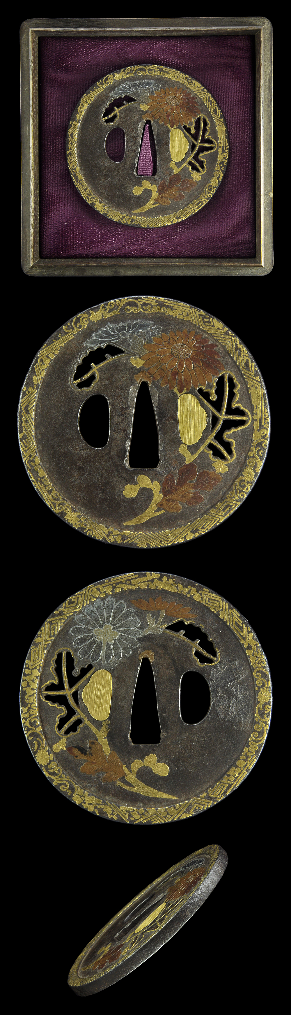 Special feature:Kyo-shoami Tsuba. On a round shape tsuba, there is a Kiku flower, gold,