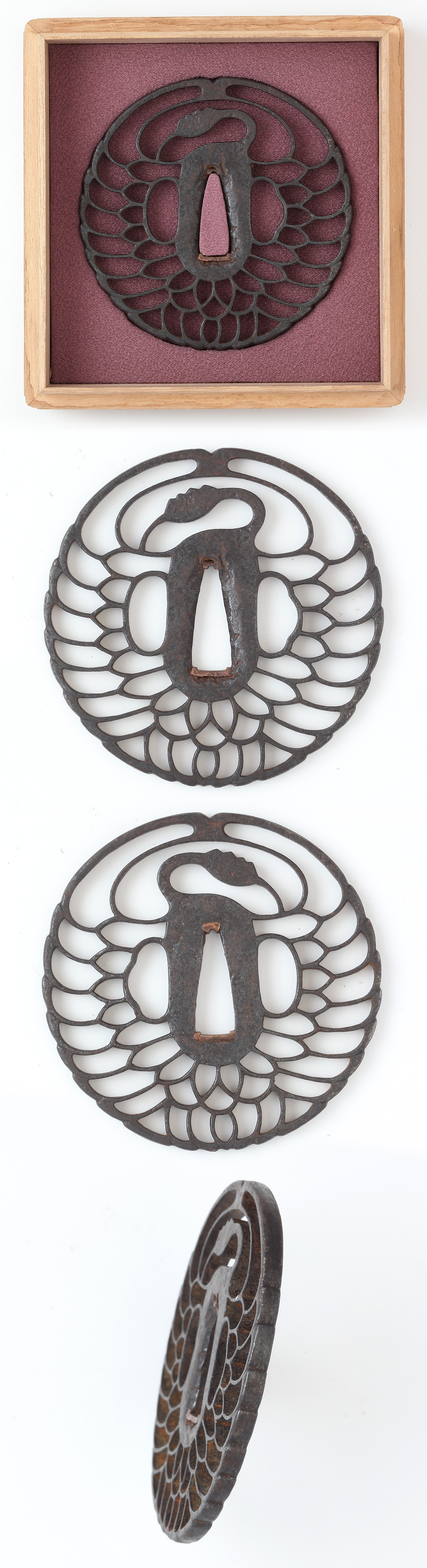 Special feature:Tsurumaru shape iron tsuchimeji sukashi tsuba with tsurumaru shape engraved. The feather openwork is elegant.