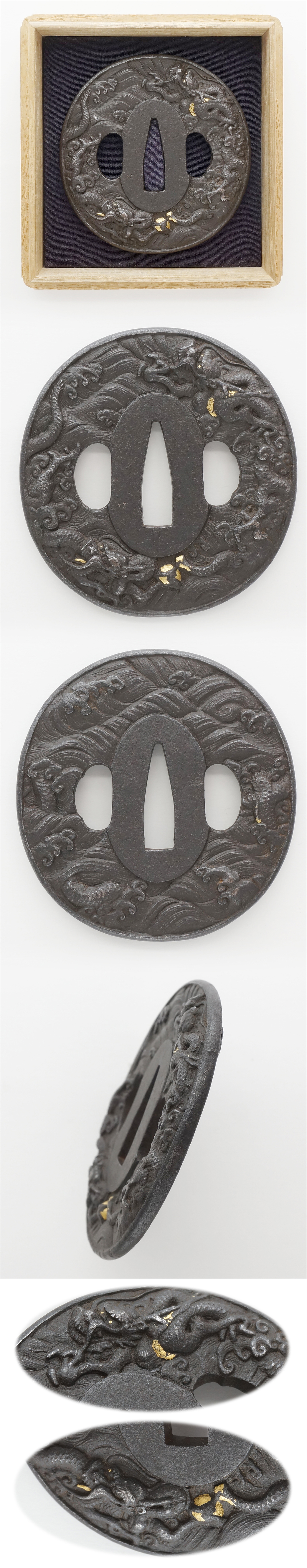 Special feature: Iron plate with billows and two dragons engraved and inlaid with gold cloth inlay. It is heavy 124g tsuba.