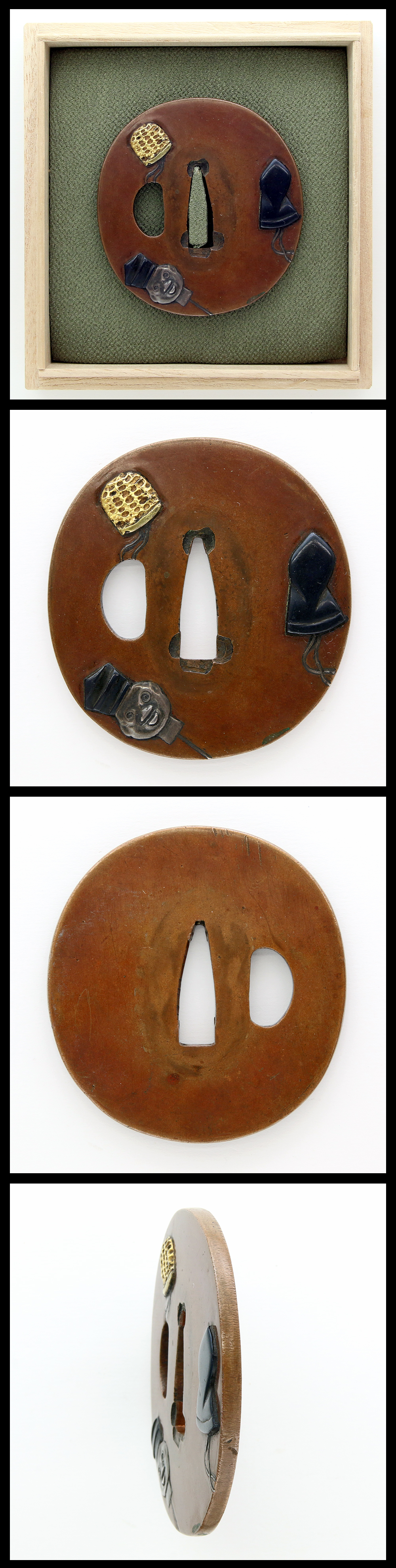 Special feature:Tatemaru shape copper tsuba with hat and Japanese puppet doll engraved and inlaid with gold, silver and shakudo.