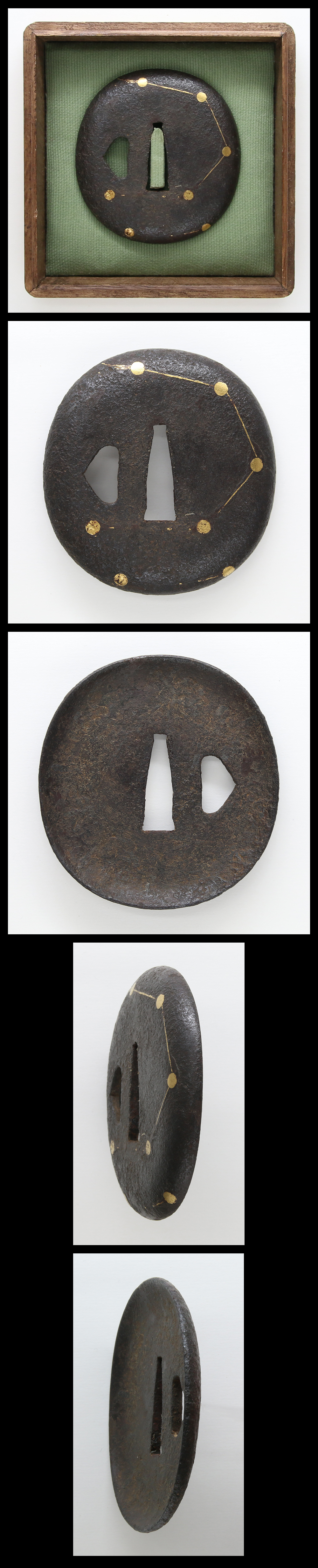 Special feature:On bowl shaped iron tsuba, some pattern is colored with gold.