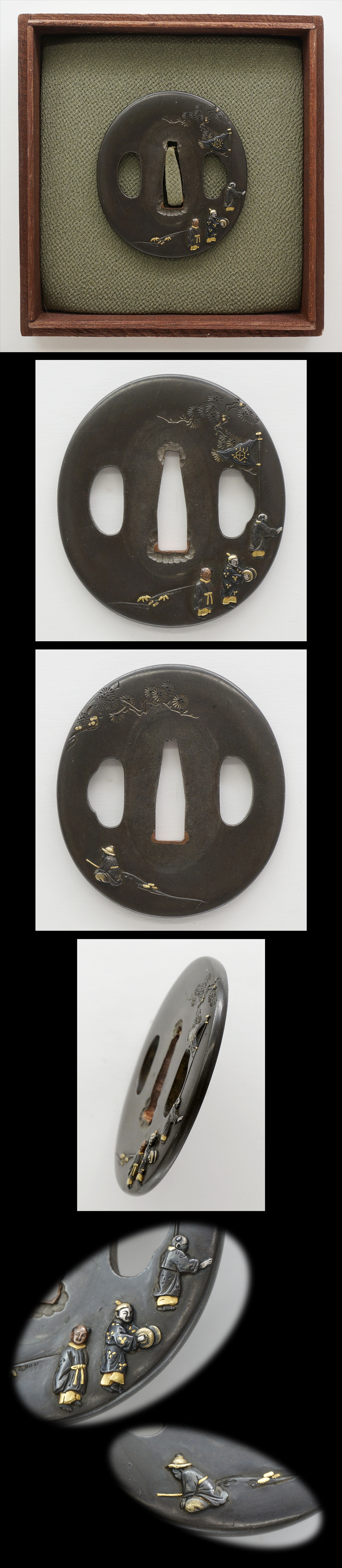 Special feature:Small size Shibuichi Migaki-Ji plate tsuba with design of Chinese children is engraved in high relief.
