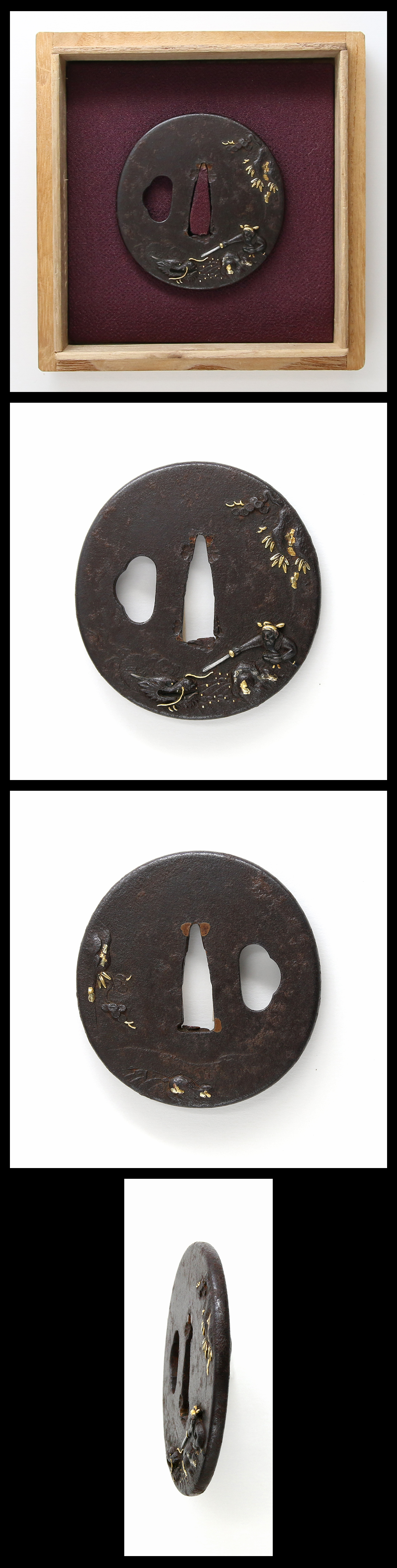 Special feature: On round shape iron tsuba, design of a man fighting with a dragon is engraved and inlayed with gold. The expression of the man and dragon is engraved well in simple iron tsuba.