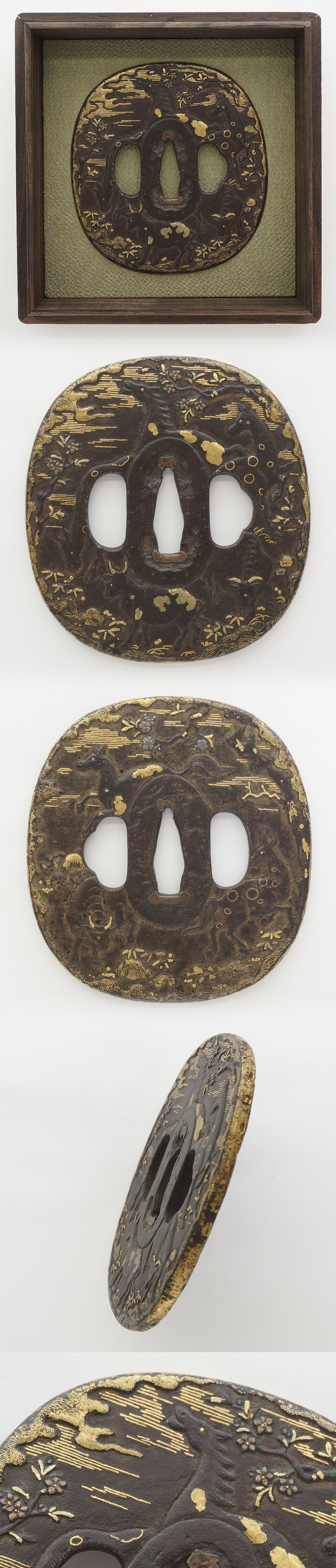Special feature: soft edge iron tsuba with cow and horse design engraved and inlaid with gold in Nunome(cloth) pattern.