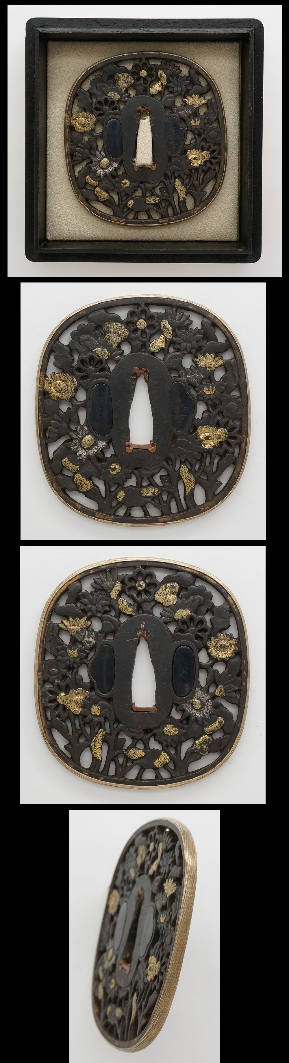 Special feature:On iron base, chrysanthemum design is engraved in open work and inlayed in gold and sliver cloth pattern. It is gold rim. The design has detail cloth pattern. It is wonderful piece of work.